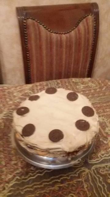 • 4   بلهنتركها لتبرد ثم نقسمها نصفين وتفرغ قطع أوريو فى الكيك حسب الرغبة نضيف فى الحشوة كيس كريم شنتية +3معالق أوريوكبيرة ونأخذ من هذا الخليط مقدار نصف كباية للتزيين